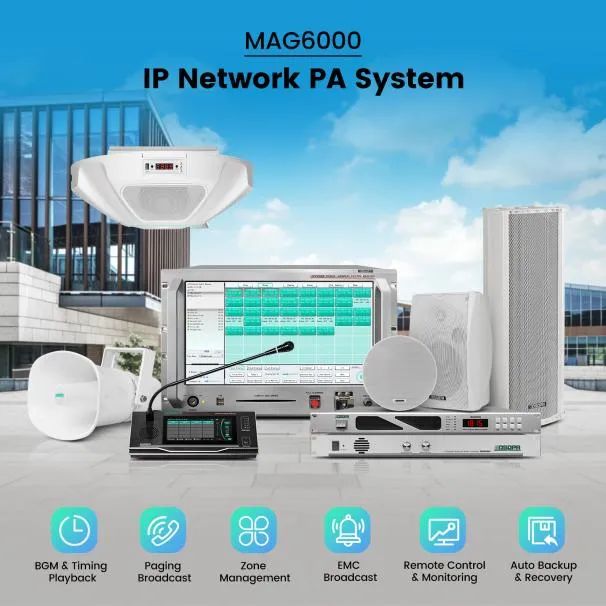 MAG6000 IP网络广播系统基于DSPPA协议,并兼容TCP/IP协议,可支持远程寻呼和定时广播,区域管理、报警语音疏散、定时播放以及定点定区播放功能。