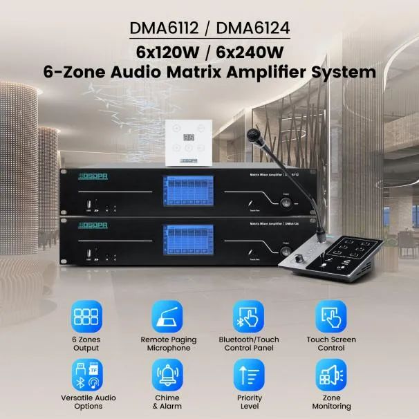 DMA6112/DMA6124 6区音频矩阵放大器系统,配备4.3"触摸屏,提供USB、FM和蓝牙等多种音频源选项,带来增强的音频体验和优化的音频控制,适用于各种场景。