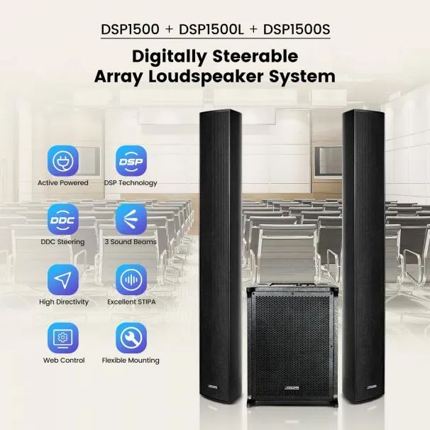 DSP1500有源相控阵音柱系统采用DSP技术和DDC波束控制技术,可生成三个独立声束,提供高指向性和卓越的语言清晰度。此外,支持网络控制,提供灵活的安装选项,为会议扩声提供高效便捷的音频解决方案。