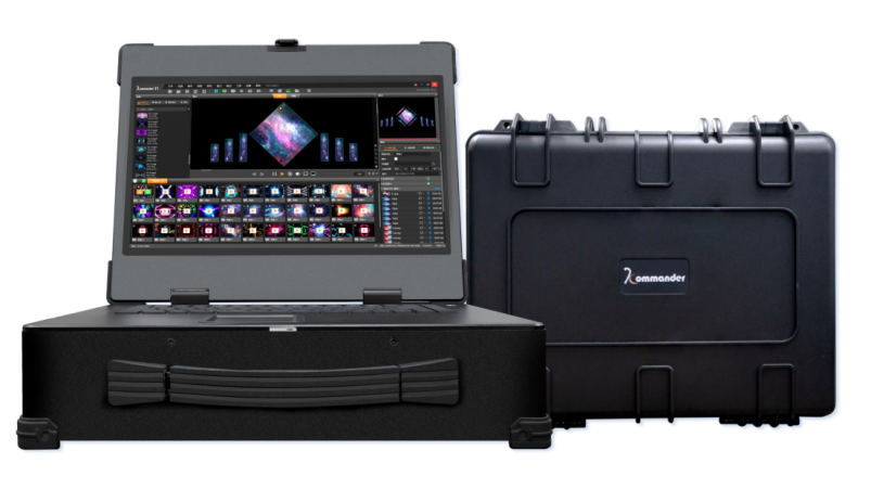 Kommander T1 Pro便携式服务器自带15.6寸1080P高清屏幕,88键机械键盘,鼠标触摸板,便携服务器加专用手提航空箱整套重量仅12.4KG。双4K通道,不限屏幕数量和素材数量,7通道输出,中小活动播控服务器首选。