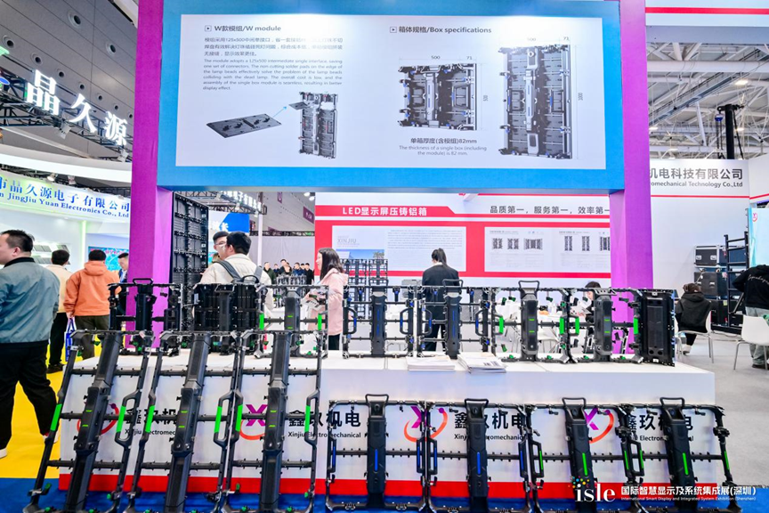 鑫玖机电在isle展会现场携自主研发的压铸铝箱体产品亮相,型号丰富,涵盖从p1.2 - p10的公模箱体,具备精度高、强度好、散热佳、抗氧化的特性,颜色多样且安装便捷,能满足舞台租赁、体育赛事、商业演出、广告标识等领域需求,还提供从压铸模具设计制造到产品后加工、表面处理的一站式解决方案 。