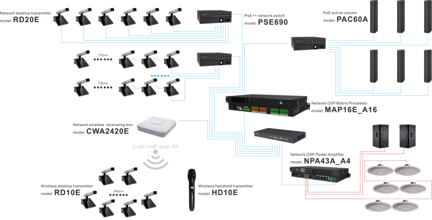全数字音频处理与传输技术,远距离传输音质不会衰减,设备之间距离最远可达150米.如实现更远距离可增加电源盒.