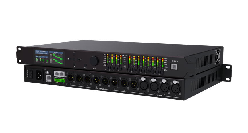 内置两通道FIR+DSP功放,功放输出功率: 800W+800W/8欧 一进两出DSP模块,高效的开关式电源,带自动电压感应,CLASS D类功放模块,直流、软启动、热保护、短路保护、峰值压限,真正解决了有源音箱因散热而产生的各种问题。输入输出多段PEQ均衡可调,输入有静音、噪声门、增益、相位、延时、旁通;分频可选IIR 或FIR双滤波选择。 全系列宽电压100-250V工作,可选单/双通道;全新标配FIR,支持外部txt文件导入,一键完成幅度与相位校正;可多机联调设置DSP参数,输入信号支持最大20V有效值输入DSP不失真:特别设计了防止输入过大引起的DSP失真压限器,这个很适用,客户在外面用的时候,他是看不到机器的灯有没有报红灯,这个机无论是调台输入多大,只要调台出来的信号不失真,输出就基本不失真;支持信号线,电源线热插拔无冲击;智能风扇控制(热量和输出功率并行控制),避免在安静场所,风扇热加速造成的噪声尴尬,内置5种参数模式可选。