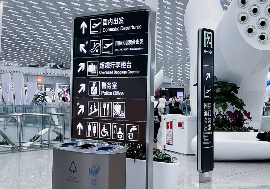 机场作为一个日常出行的大型场所,导视系统建设的重要性不容忽视。它不仅在旅客出行过程中发挥着关键作用,为旅客提供清晰、明确的导航指引,确保旅客在复杂多变的机场环境中能够迅速、准确地找到登机口、行李提取处等关键位置,从而有效缩短旅客的等待时间,提高出行效率。同时,一个完善、智能的导视系统还能够提升机场的整体形象和旅客的满意度,为旅客带来更加便捷、舒适的出行体验。从机场导视标识系统的前期规划,到深化设计、生产、施工、运维,柯赛标识可以完整的服务方案,且公司在通过智慧标识的升级来提升企业,以求持续为机场导视系统建设提供更好的服务。
