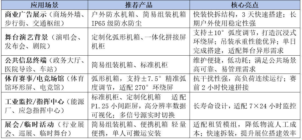 公司核心产品品类丰富,涵盖简易组装机箱、户外防水机箱、定制化弧形机箱及一体化拼接屏机柜等全系列LED显示屏机箱。依托自主研发实力与柔性化生产线,可根据客户独特的使用环境与功能需求,提供针对性的定制化解决方案,凭借优质产品与高效售后,诚盼与全球伙伴共赢合作。