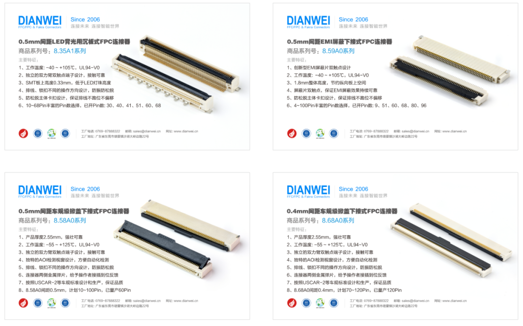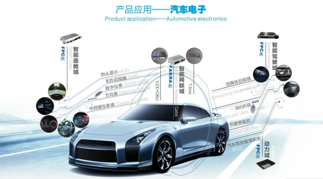 公司自主研发生产的FFC/FPC电子连接器、Type-C连接器、板对板连接器、Fakra同轴射频连接器及线缆组件等产品,主要应用于: 汽车电子、医疗电子、智能家电、消费电子、安防设备等领域,持续为TCL、小天才、美的、宇树科技、创维、施耐德等国内外优质企业提供稳定的产品配套服务。