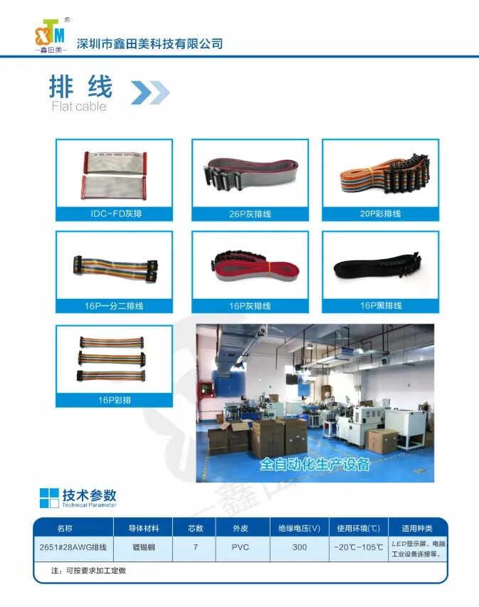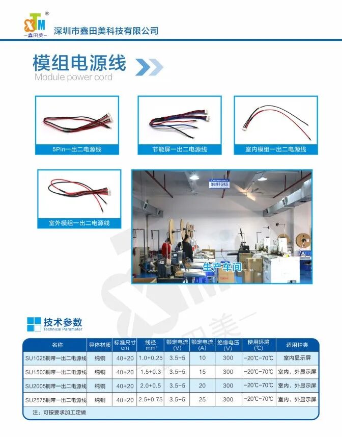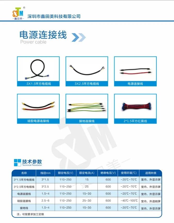 深圳市鑫田美科技公司有多年从事LED显示屏配套线材从生产、销售、售后方面的经验,具备为相应屏幕配件的配套服务的能力。排线、电源线、电缆线、网线等连接线,从源头把控用料、执行国家3C强制标准,电子线、排线均执行UL标准;公司生产出厂线材均按实际平方数出产,电源线整套全部采用阻燃材料,生产过程都经过严格执行ISO9001质量管理体系,经过检验合格出厂,保证出厂质量,在行业内赢得美誉。