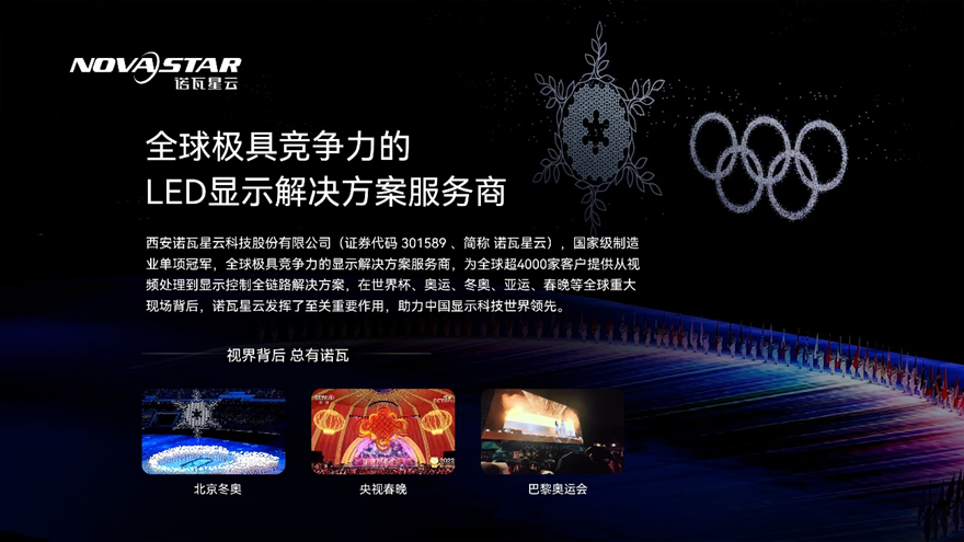 西安诺瓦星云科技股份有限公司,国家知识产权示范企业、国家专精特新“小巨人”企业,全球极具竞争力的显示解决方案服务商,为全球超4000家客户提供从视频处理到显示控制全链路解决方案,广泛应用于安防监控、指挥调度中心、会议小间距、广告传媒、舞台演艺、商业显示、虚拟拍摄、广电系统等市场,在世界杯、奥运、冬奥、春晚、阅兵等重大现场背后,均有诺瓦技术的保驾护航。