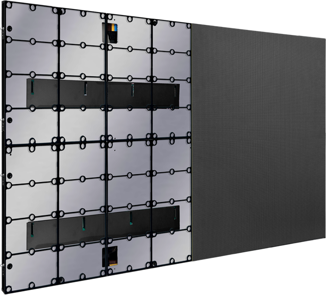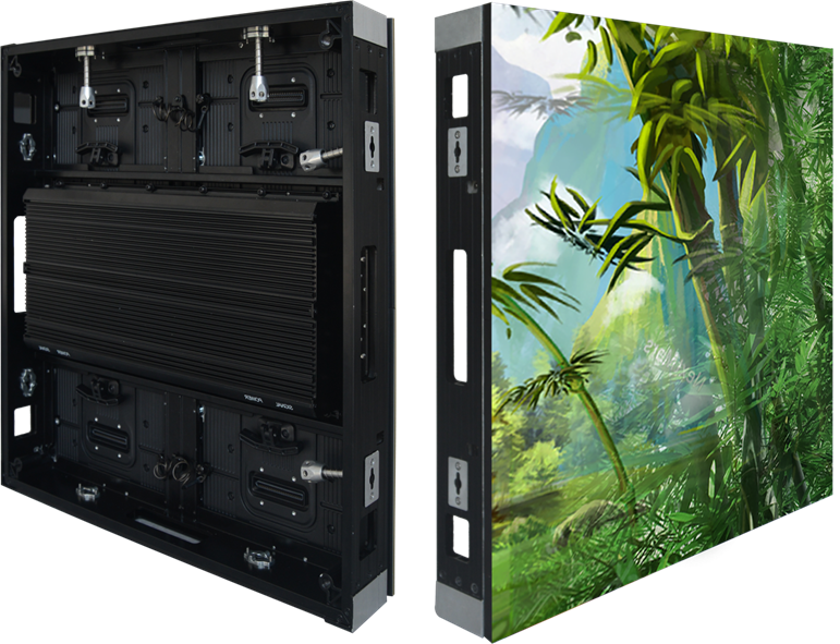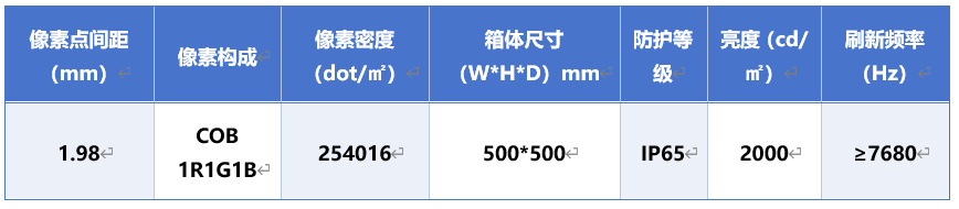 箱体选用标准化尺寸的500mm*500mm型材铝箱体,兼容点间距:1.56mm/1.95mm COB工艺模组;