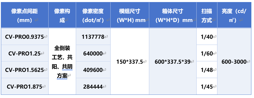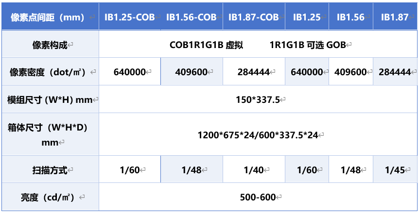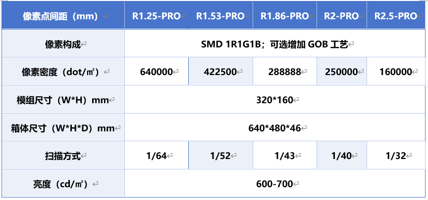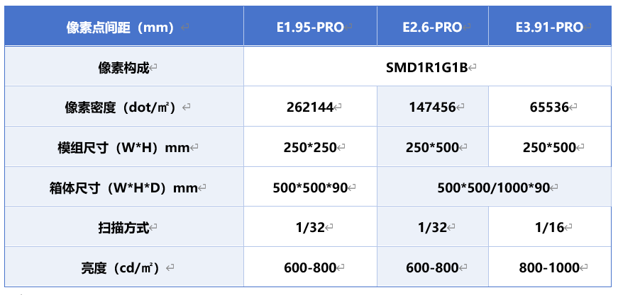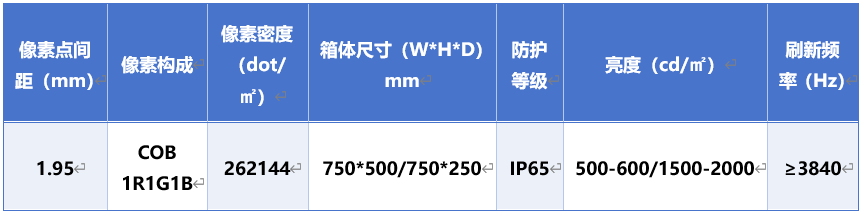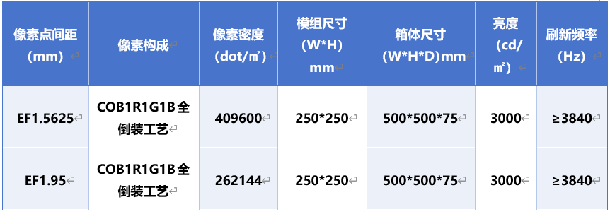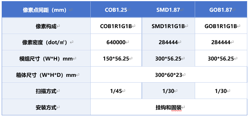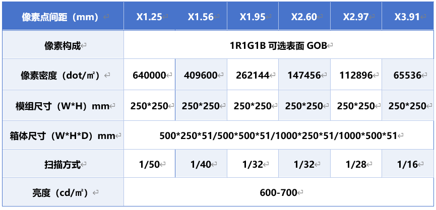 模组尺寸:200mm*500mm/250mm,箱体尺寸:1000mm*500mm,点间距1.25mm/1.56mm/1.95mm/2.6mm/2.97mm;