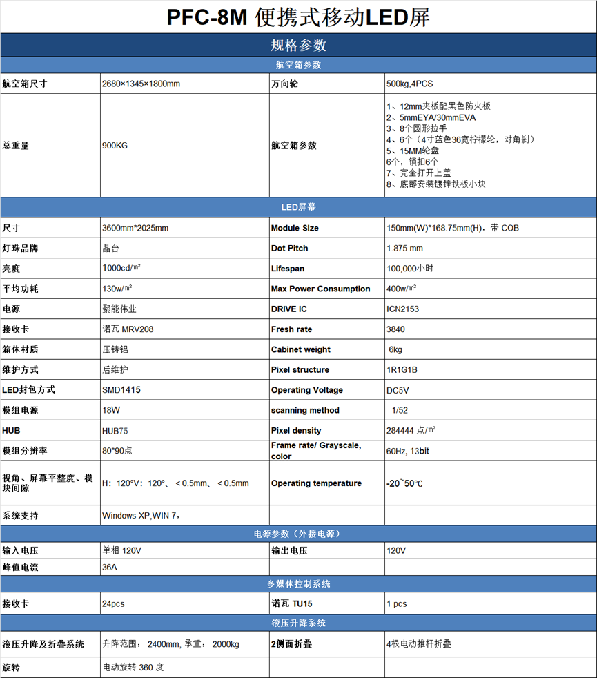 PFC-8M型8㎡便捷式LED折叠屏是一种集成了LED显示屏和航空箱的产品,其外观设计紧凑,结构坚固,便于携带和运输。JCT新推出的一款型号为PFC-8M的便捷式LED折叠屏集成了液压升降、液压旋转和液压折叠技术,总重量为600KG。只需简单的按钮操作,便可将展开后面积为3600mm*2025mm的LED屏幕折叠收拢在2500×1000×1800mm的航空箱内,使日常运输和移动更加便捷。