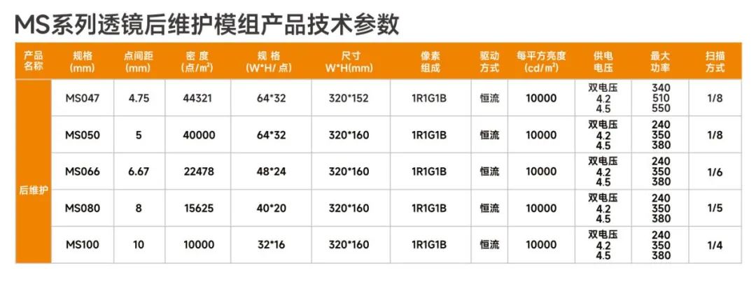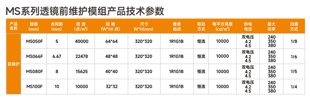 户外高亮透镜表贴,亮度高于12000cd/平方,P5/P6.67/P8/P10前维护透镜模组,P4.75/P5/P6.67/P8/P10/P10.416后维护透镜模组。