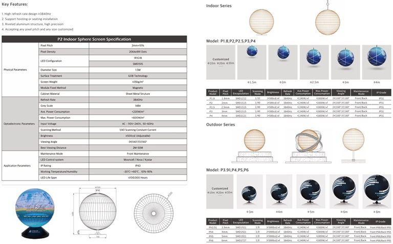 球形 LED 屏幕,从任何角度都能吸引每个人的目光。身临其境的体验,适用于任何活动的高分辨率、生动的显示效果,安装简单,即插即用,可定制尺寸。