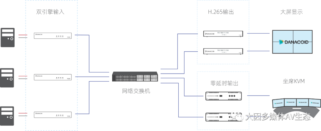 DANACOID结合当下分布式应用和当前分布式给用户带来的延时高、丢包、卡顿、色彩还原低等困扰,采用新的方案设计,推出分布式10G 双引擎分布式系统。最高分辨率可达4K @60Hz 4:4:4 全采样、高动态范围HDR10杜比视效,符合光纤或7类网线两种接口传输信号,并且对信号不进行任何压缩处理,从本地传输到远端信号可达零延时。