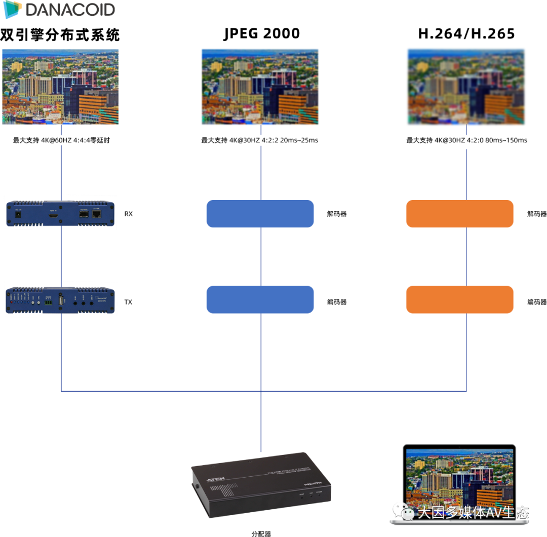 1 无压缩和标准压缩同时传输:以现有的分布式为例,分为深压缩和浅压缩两种,简单来讲压缩是由于视频信号的传输网络带宽太大,满足不了视频传输标准,所以采用压缩降低带宽的方式传输信号,压缩不仅会造成画面色彩丢失,而且在解压过程出现丢包、马赛克、卡顿等现象。所以低带宽传输必将牺牲画质和色彩。双引擎系统基于万兆以太网可通过一根网线同时提供一路4K @60Hz无压缩 和标准H.265压缩信号,同时兼容两个平台对接应用。