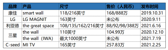 据不完全统计,截止目前,康佳、LG、三星、C-Seed、利亚德等全球品牌均已发布了MicroLED电视,尺寸和售价各不相同。整体来看,利亚德 / Planar 6月发布的Micro LED电视尺寸覆盖108英寸、135英寸、162英寸以及216英寸,选择最多,并且产品已在官网及官方小程序开启预售。