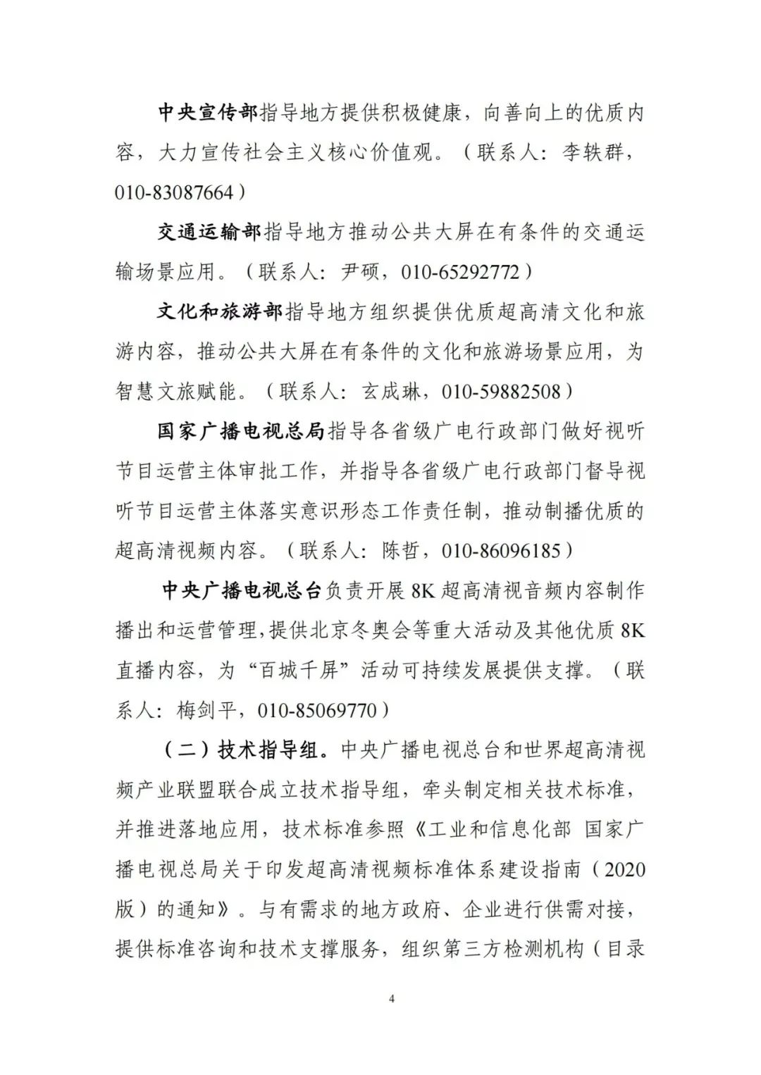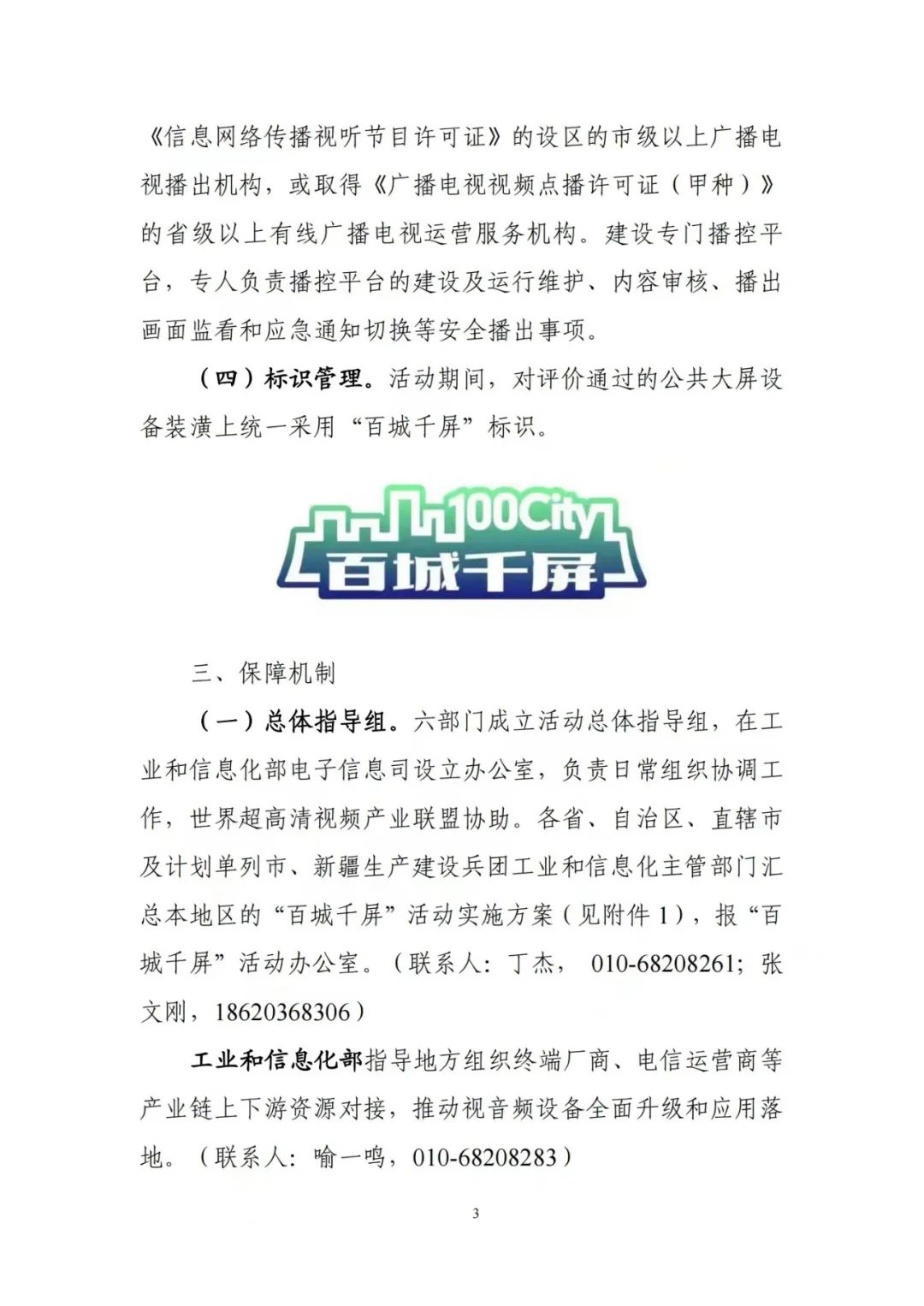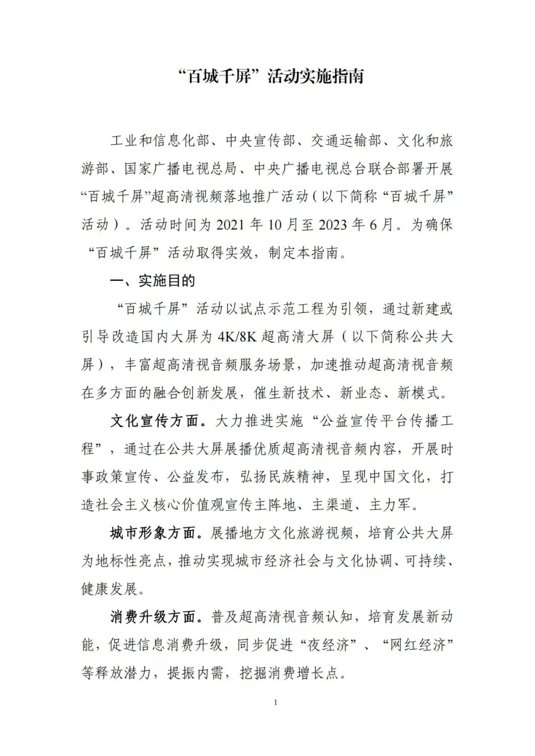 按照《关于开展“百城千屏”超高清视频落地推广活动的通知》(工信部联电子函〔2021〕271号)部署,为确保“百城千屏”活动取得实效,现将《“百城千屏”活动实施指南》印发给你们,请结合实际情况认真贯彻执行。