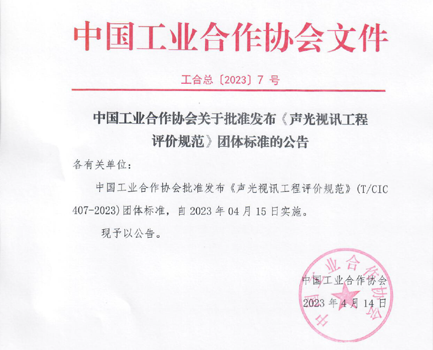 在中国工业合作协会田玉萍理事长等协会领导,以及行业内众多资深专家的关怀和参与下,自2021年提出“声光视讯工程评价规范”团标构想,经过艰难而卓优成效的推进和编写工作,2023年4月14日,中国工业合作协会下发通告,正式批准《声光视讯工程评价规范》(T/CIC 407-2023)团体标准,并自4月15日起实施。