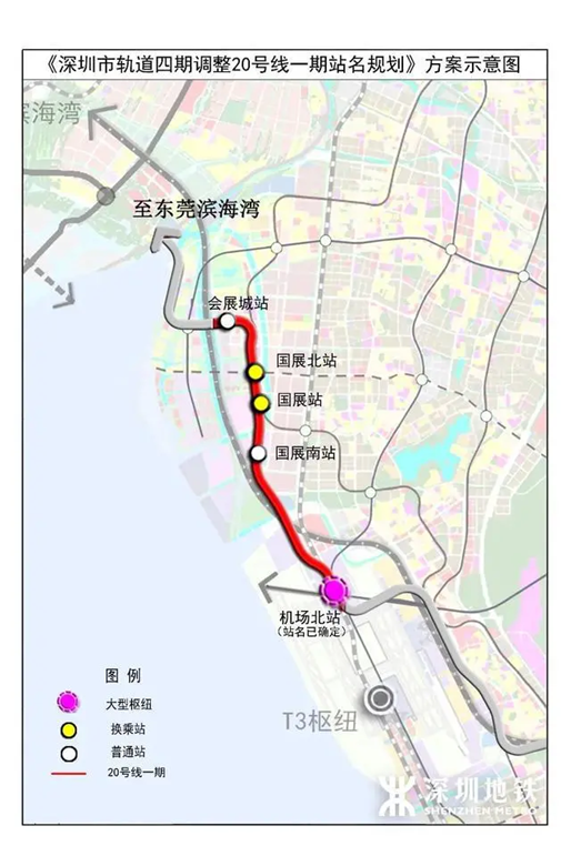 据了解,深圳地铁20号线一期起于机场北站,止于会展城站,全线均位于宝安区,远期预留延伸到东莞的条件,线路全长8.43公里。