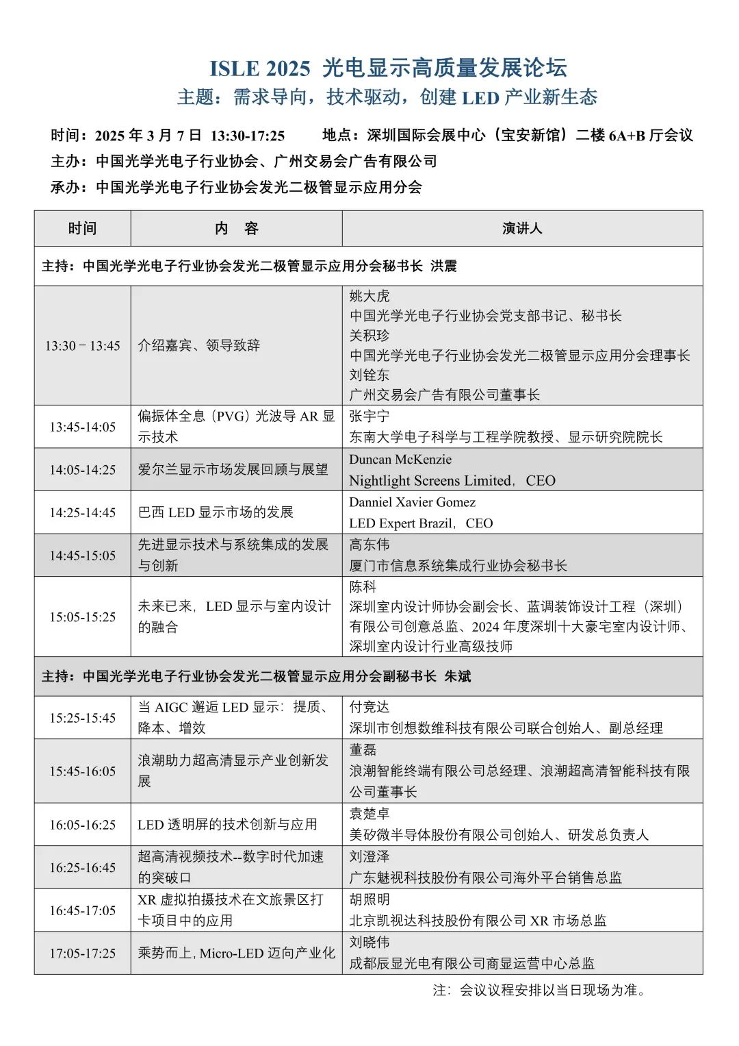 在ISLE2025展会现场,组委会将举办主题为“需求导向,技术驱动,创建LED产业新生态“的光电显示发展高质量论坛。论坛将从技术创新与产业融合出发,聚焦强链补链推介、高峰主题演讲、国际交流、产业融合应用等内容,邀请学界知名教授、行业知名专家、企业家一起,共同探讨光电行业产学研用的深度融合,分享行业最新发展趋势和前沿技术动态,打造资源共享、跨界融合的交流平台。