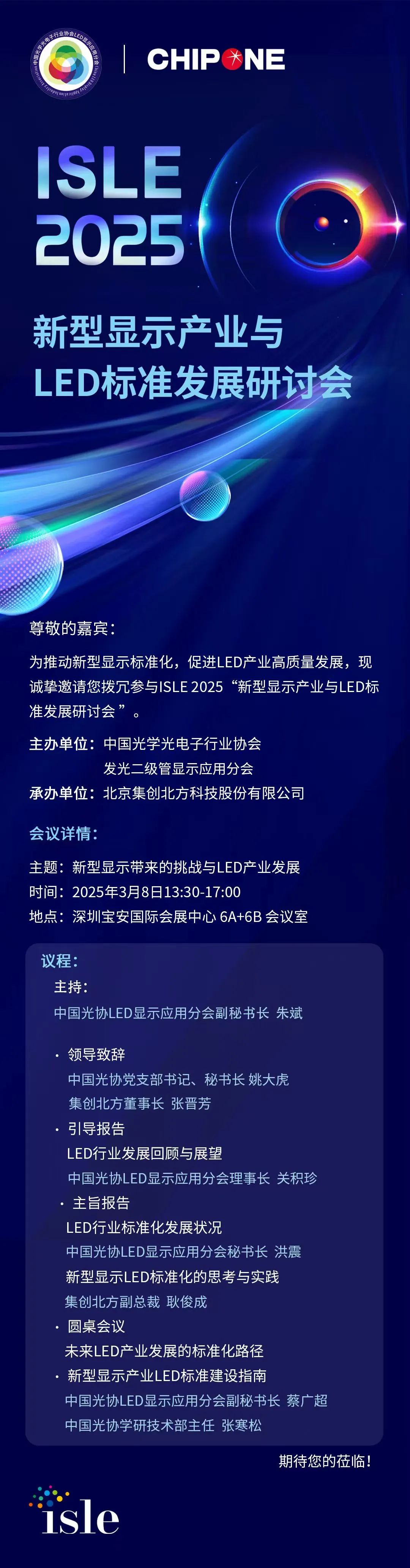 前往注册登记为推动新型显示标准化,促进LED产业高质量发展,实现业内良性循环,同时也为未来LED技术的发展提供有力支撑,现诚挚邀请您参与ISLE2025“新型显示产业与LED标准发展研讨会”。