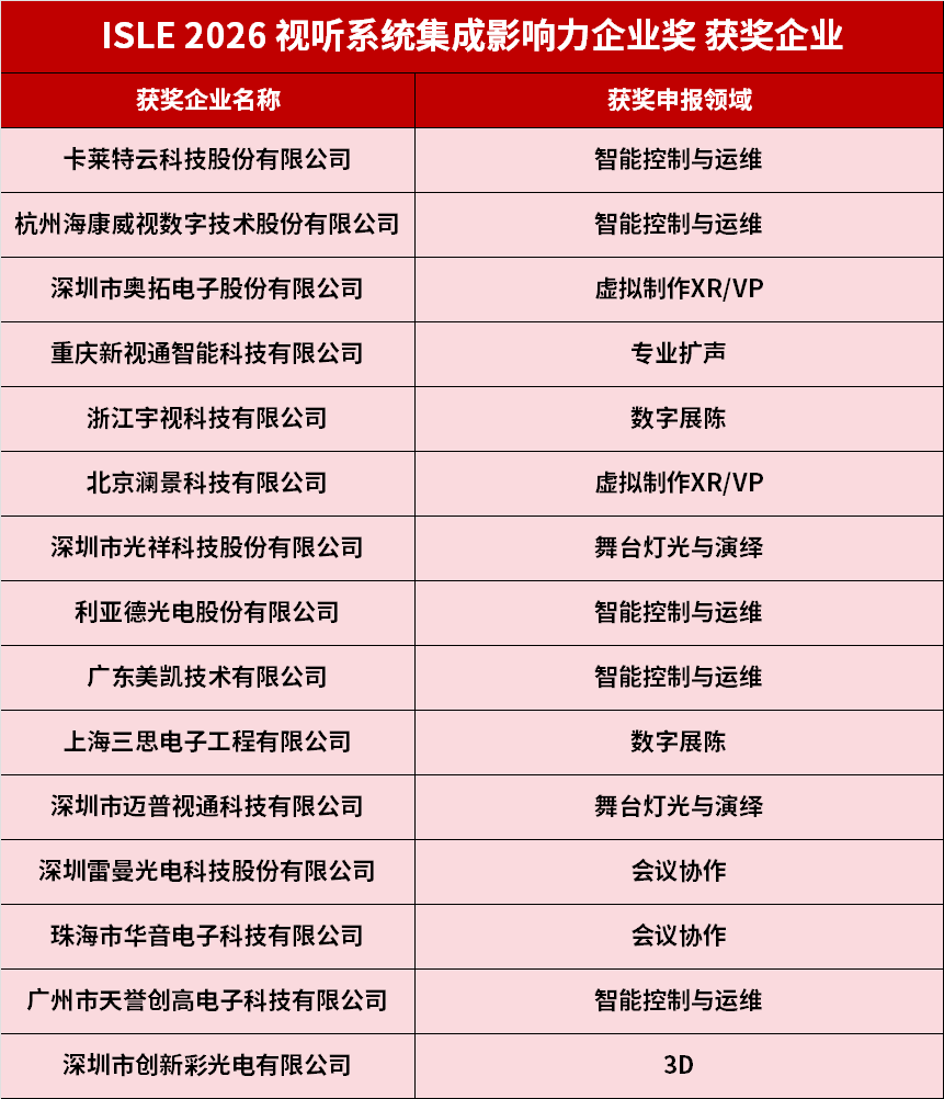 的脚步,一起先来了解“ISLE 2026 视听系统集成影响力企业奖”都有哪些企业的产品获奖吧