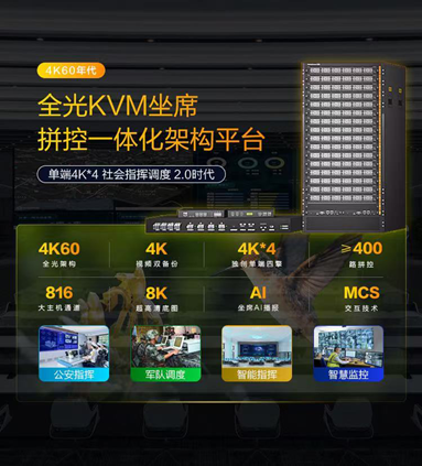 MediaComm美凯4K60全光KVM坐席拼控一体化平台,以全光通信与坐席拼接一体化为核心架构,依托空分光交换技术提速增效,集成坐席与大屏拼接功能,部署灵活稳定。具备4K双备份显示(专利:ZL2018 2 1843453.0)、单端4路4K60处理能力,支持超400路信号拼控及灵活叠加内容。AI坐席系统实现人脸登录(软著:2025SR0278894)、智能播报与应急弹窗告警。专利MCS技术凭FPGA算法(专利:ZL2023 1 0247645.4)达成毫秒级交互、无缝混切,加密传输,适配多场景需求。